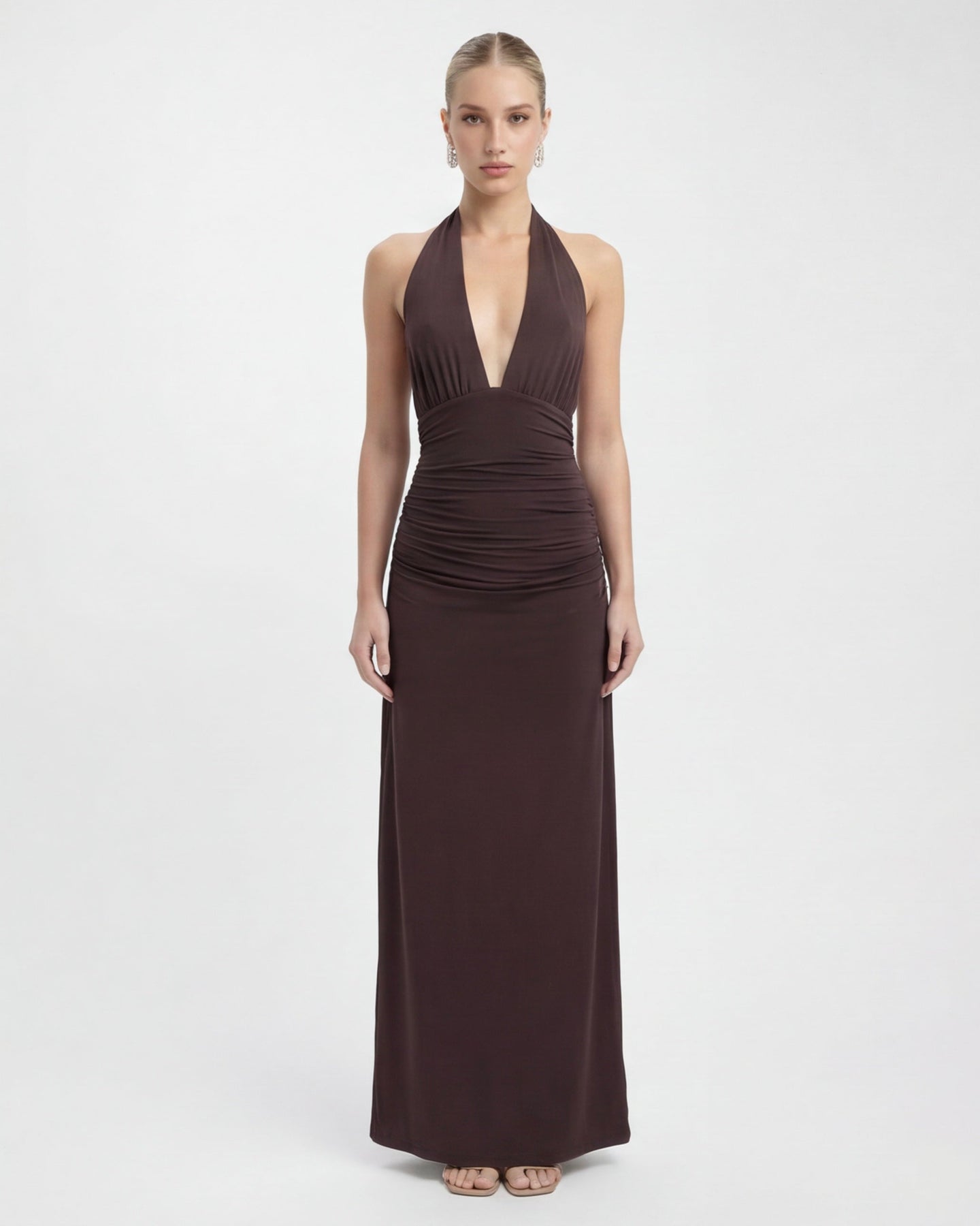 Late-night energy meets effortless elegance. The Florence Nyx Halter Maxi is made for main-character moments, featuring a deep plunge neckline, soft ruching through the waist, and a stunning open back with adjustable ties. Sleek, minimal, and confidently bold, this dress is designed to turn heads with zero effort.